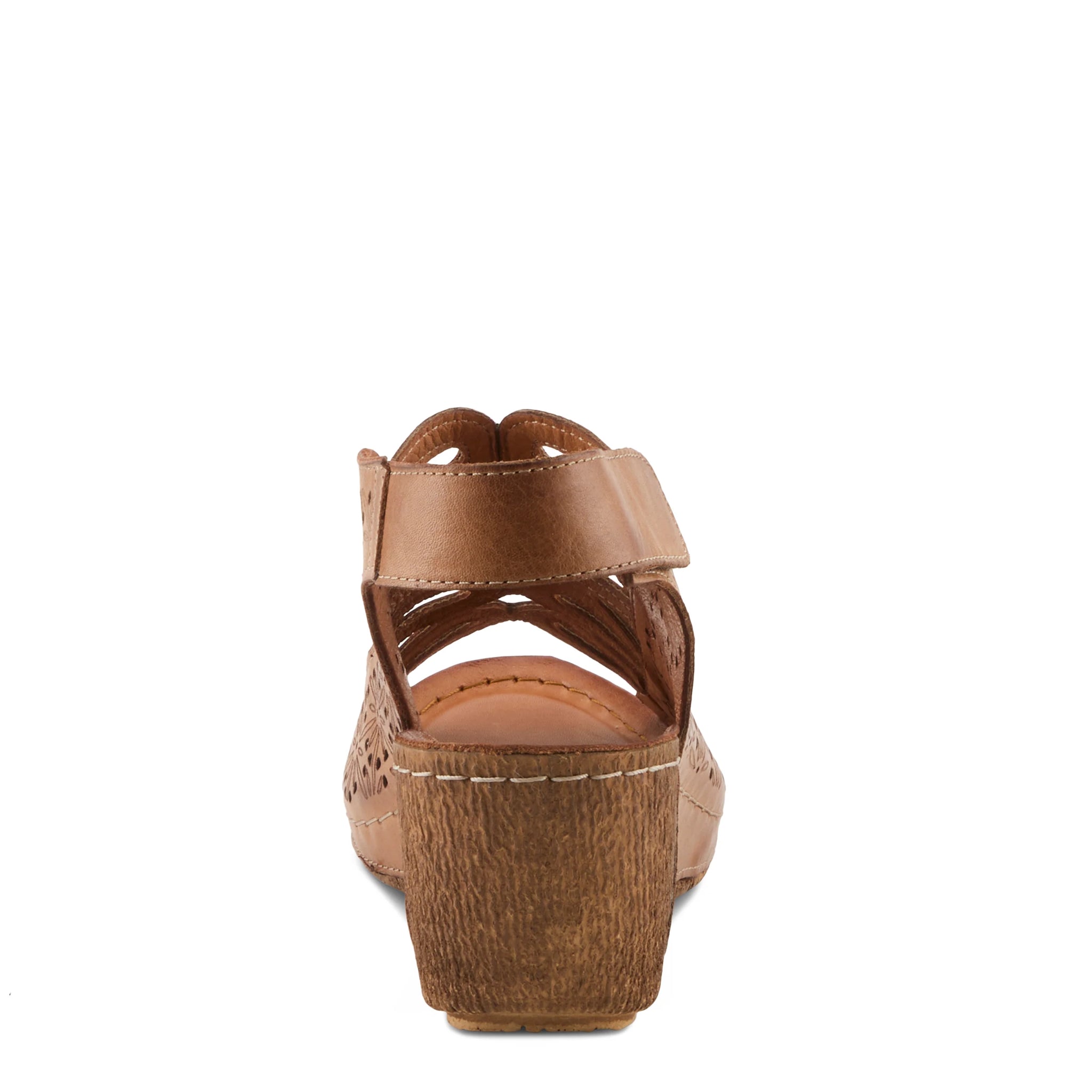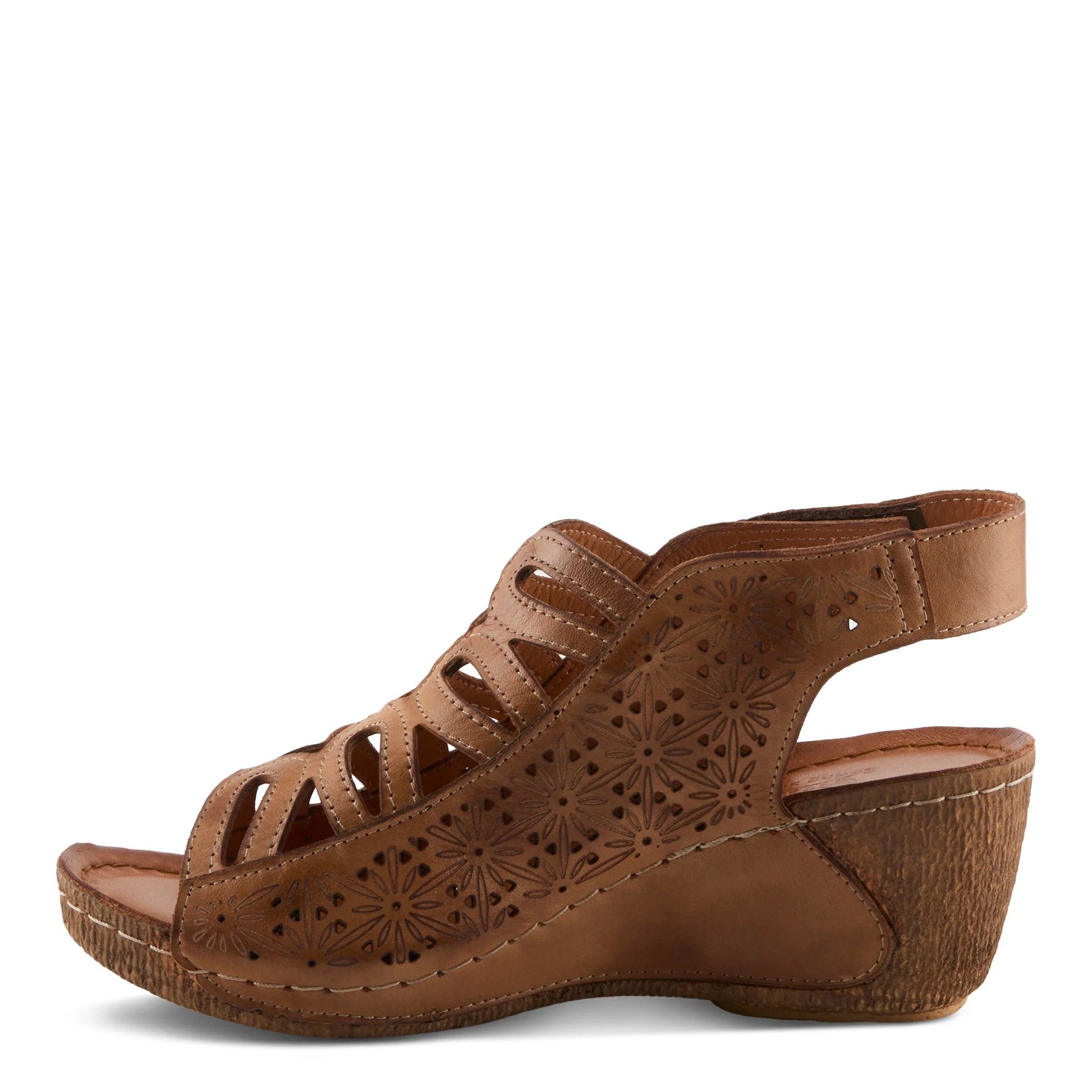 Mediterranean influenced, premium leather sandal featuring a beautiful laser etched floral cutout design for increased flexibility and breathability. The tear drop pattern at the top of the shoe give it a playful edge. The strong stitched to sole construction give it durability and the comfort wedge with a flexible forefoot provide an easy wear.