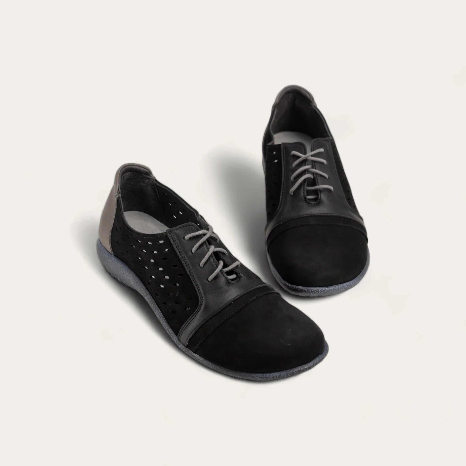 The Lalo is a versatile and classic shoe. Its laces, cutouts, and multitude of materials make it stand out as a go-to choice for everyday fall wear. The Lalo is built with Naot's removable, anatomic cork and latex footbed, which is wrapped in pampering suede and molds to the shape of the foot with wear. The Koru Collection features a 1" polyurethane sole which is extremely lightweight, durable and slip resistant. This collection uses a hand-sewn Strobel construction making it strong and extremely flexible. American Podiatric Medical Association (APMA) Accepted for promoting good foot health. Our patented Naot Replacement Footbeds are also available for Lalo.