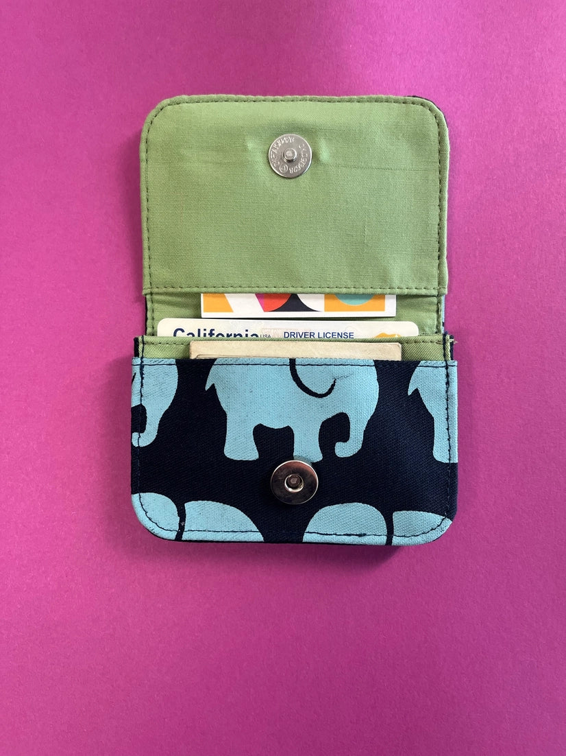 Perfect for use as a business cardholder or as a small wallet. The unique, screen printed design is fun and fashionable. Each cotton fair trade card holder is hand printed and sewn. Perfect size for credit cards, driver's license, business cards!